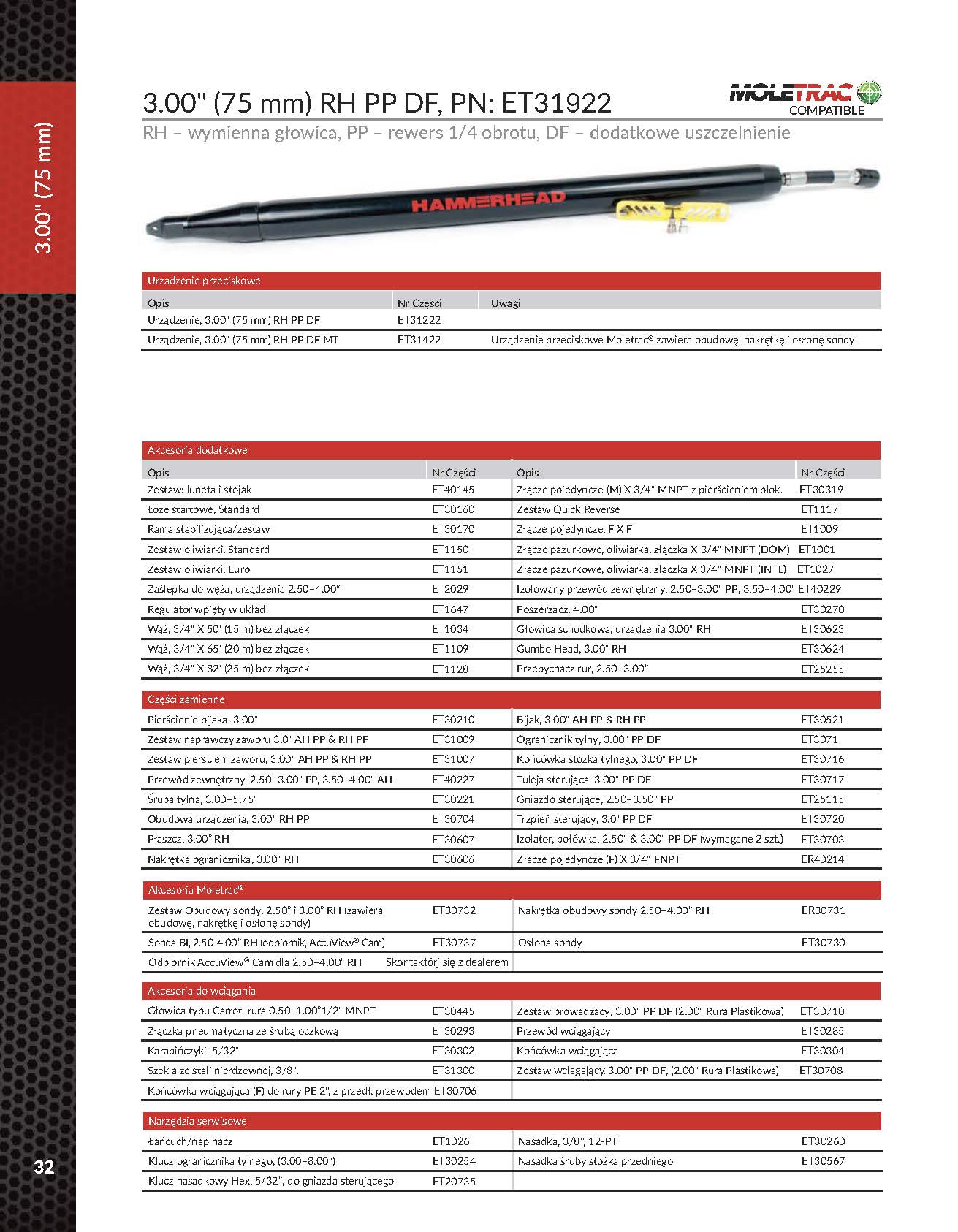 System MOLETRAC® jest w pełni kompatybilny ze modelami kretów HammerHead z nieruchomą głowicą o średnicy od 67-98 mm – co pozwala na jego uniwersalne zastosowanie w różnych warunkach terenowych i projektowych.