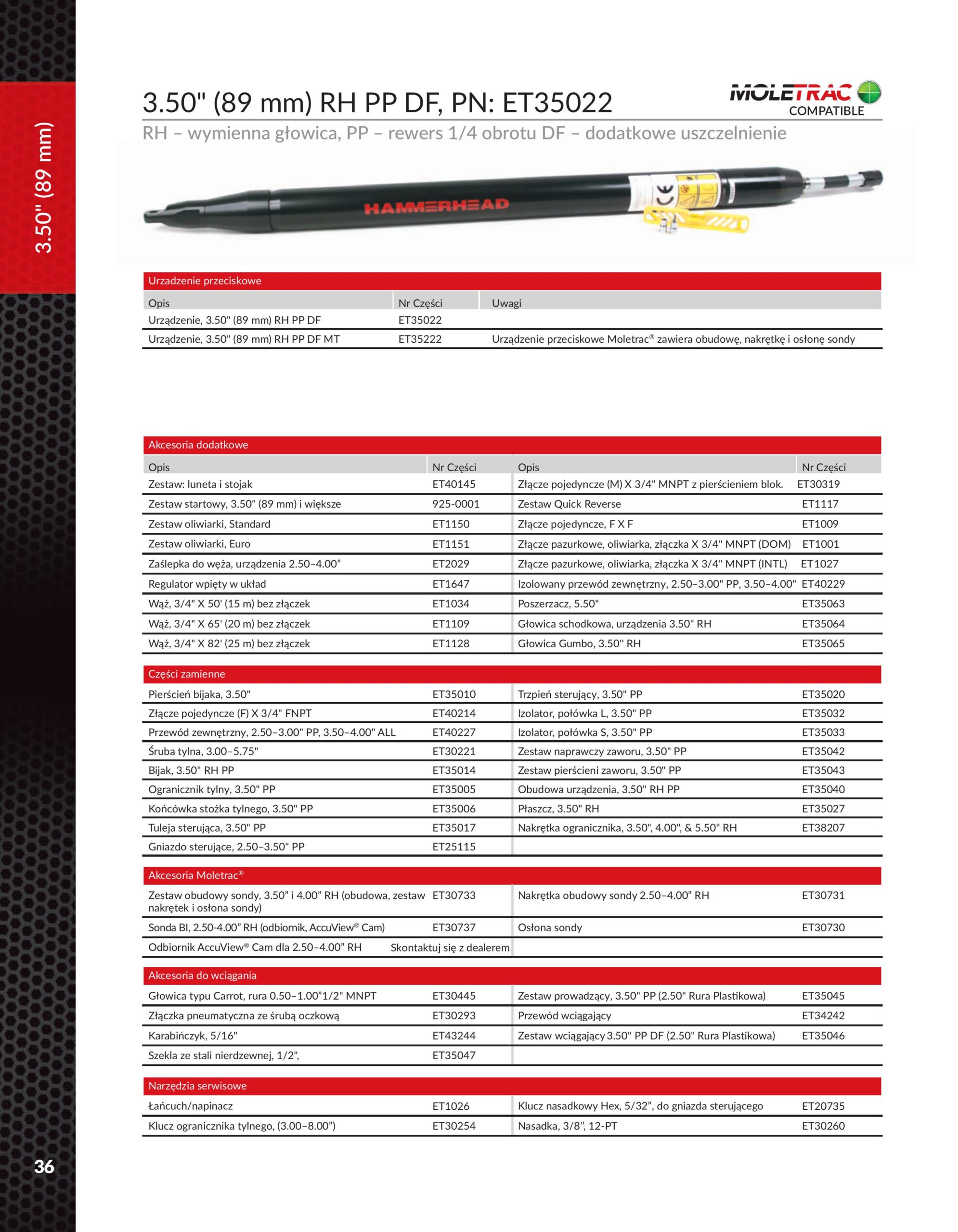 System MOLETRAC® jest w pełni kompatybilny ze modelami kretów HammerHead z nieruchomą głowicą o średnicy od 67-98 mm – co pozwala na jego uniwersalne zastosowanie w różnych warunkach terenowych i projektowych.