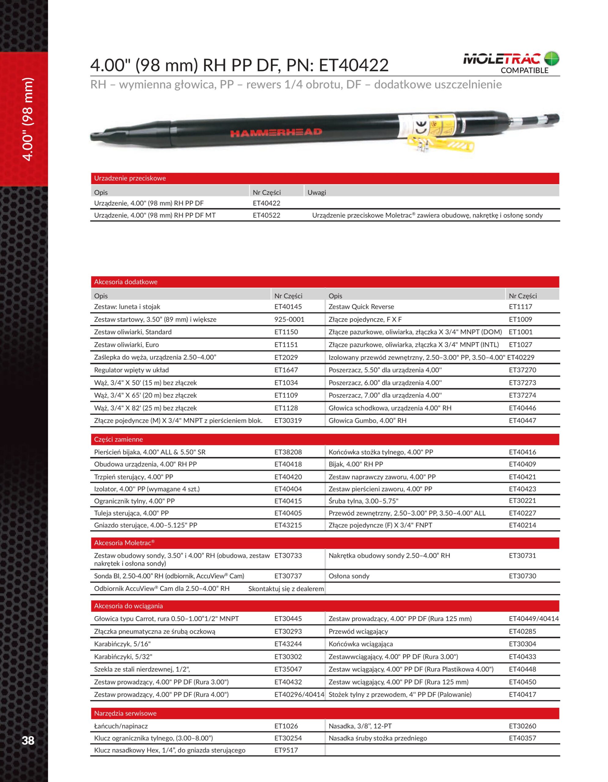 System MOLETRAC® jest w pełni kompatybilny ze modelami kretów HammerHead z nieruchomą głowicą o średnicy od 67-98 mm – co pozwala na jego uniwersalne zastosowanie w różnych warunkach terenowych i projektowych.