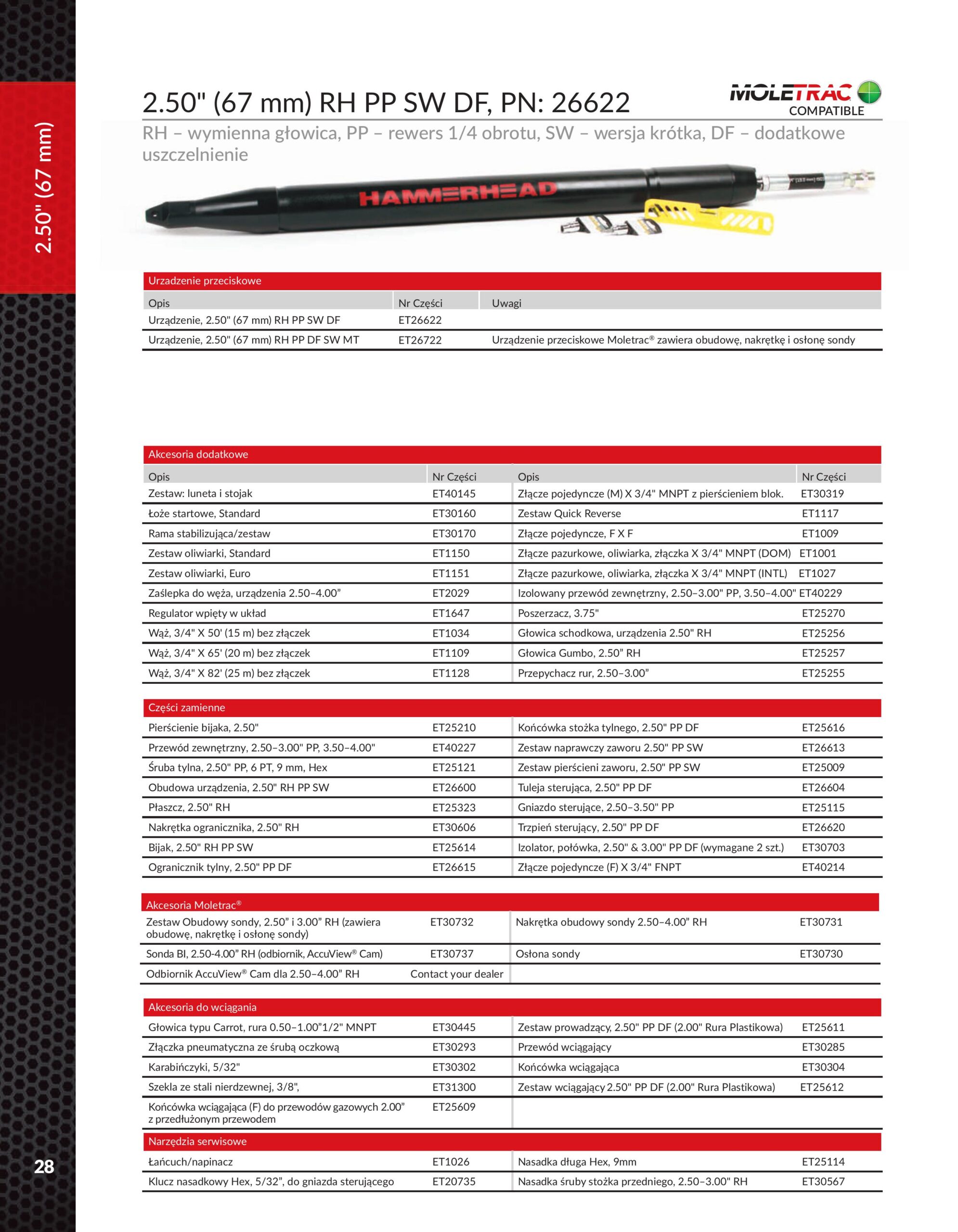 System MOLETRAC® jest w pełni kompatybilny ze modelami kretów HammerHead z nieruchomą głowicą o średnicy od 67-98 mm – co pozwala na jego uniwersalne zastosowanie w różnych warunkach terenowych i projektowych.