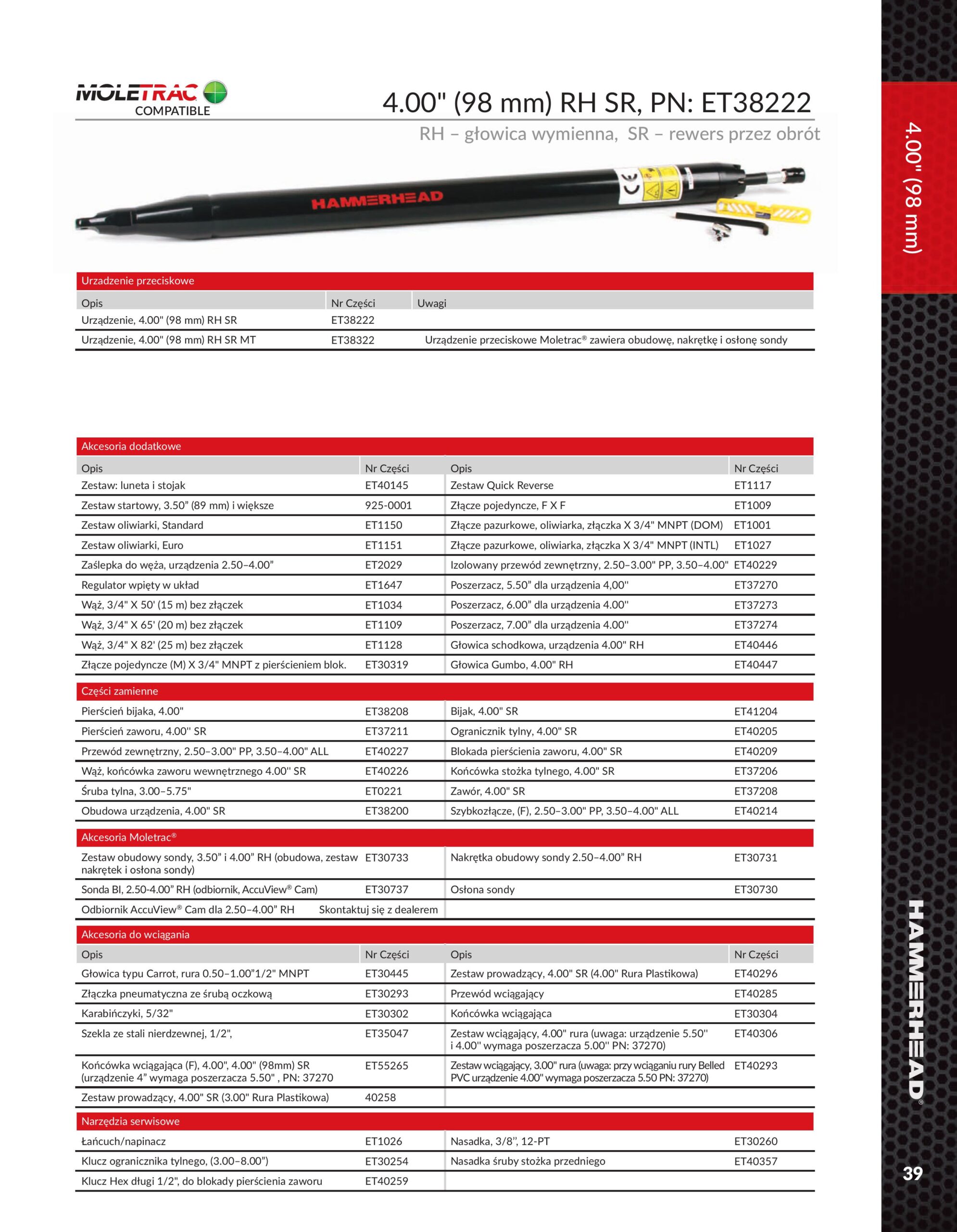 System MOLETRAC® jest w pełni kompatybilny ze modelami kretów HammerHead z nieruchomą głowicą o średnicy od 67-98 mm – co pozwala na jego uniwersalne zastosowanie w różnych warunkach terenowych i projektowych.
